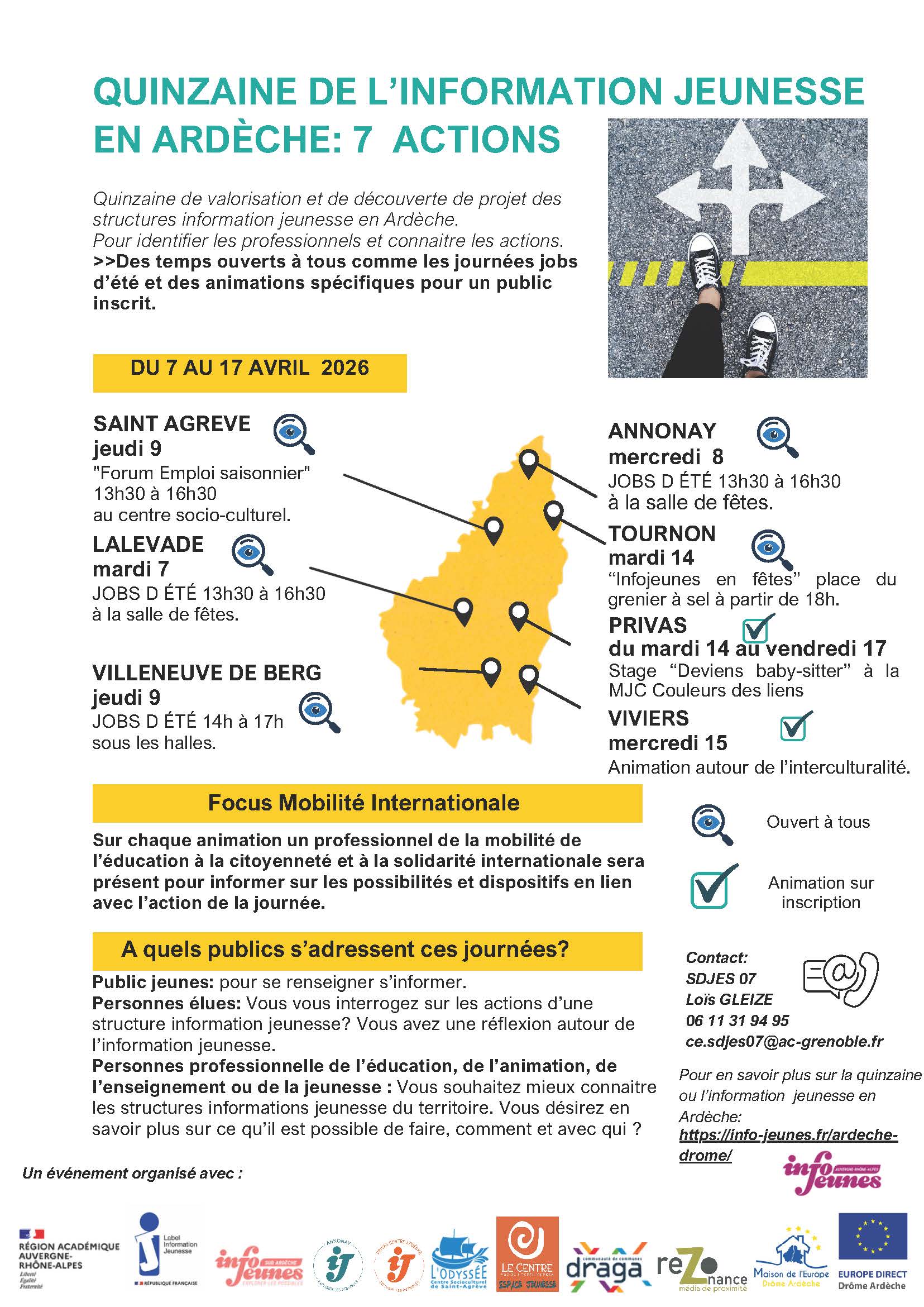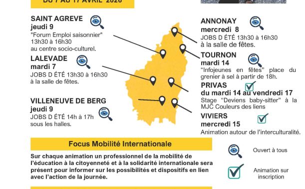 Le réseau des structures Information Jeunesse de l’Ardèche, avec le soutien du Service Départemental Jeunesse Engagement Sports (SDJES), organise une Quinzaine de l’Information Jeunesse comprenant un focus sur la mobilité internationale.