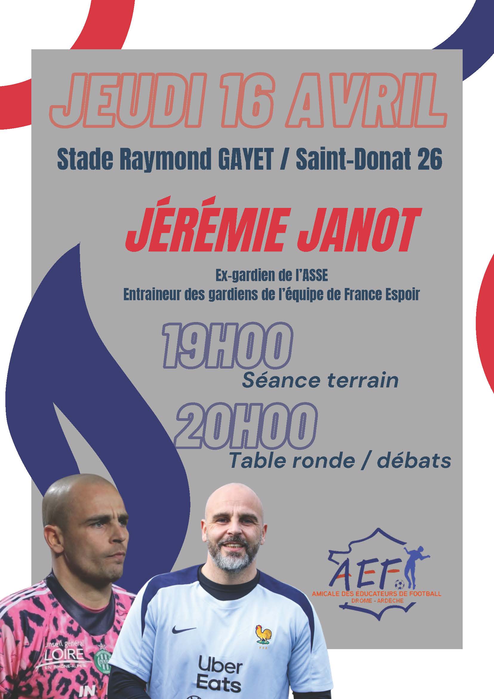SÉANCE / DÉBAT - AMICALE DES EDUCATEURS DE FOOTBALL 26-07 L'Amicale des Éducateurs de Football Drôme-Ardèche (AEF 26-07) recevra Jérémie JANOT : ancien gardien de l’ASSE, actuel entraîneur des gardiens...